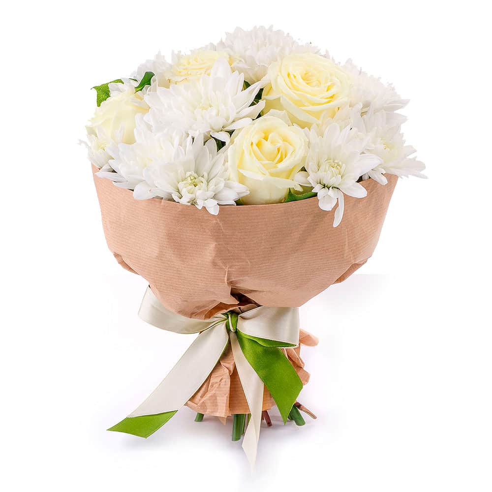Роза одноголовая белая, хризантема кустовая белая.