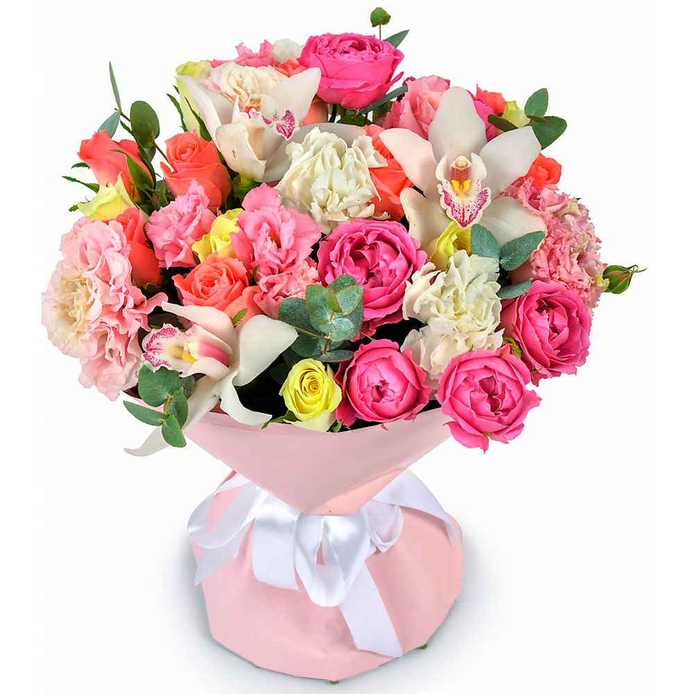 Роза пионовидная кустовая, эустома, орхидея, роза кустовая российская, эвкалипт.